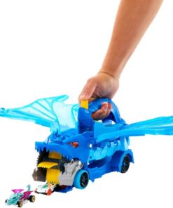 Scheur de strijd tegemoet met deze reusachtige draaktruck met een extra, afneembare draak die speelgoedauto’s opeet! Nadat je met de vuurspuwende draak auto’s hebt uitgeschakeld, maak je de kleinere draak los en verander je de grote draak in een racebaan! Druk op de knop om zijn vleugels te laten bewegen zodat hij op een echte draak lijkt, en klap ze daarna in zodat hij auto’s kan opeten. Keer terug naar de grote draak en zet de auto’s in de lanceerders waarna ze zij aan zij de banen op kunnen racen! De truck bevat twee auto’s (schaal 1:64), maar je kunt meer dan 20 auto’s op en in de twee draken stallen. Geschikt voor kinderen vanaf 4 jaar.
