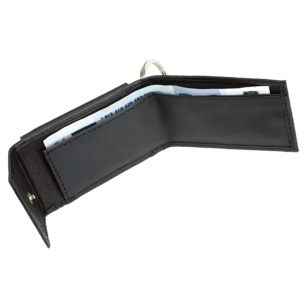De etui van zwart nappa leer heeft een metalen embleem en sleutelhanger een klein vak voor papiergeld en munten. De maat is c.a. 8.5x5cm