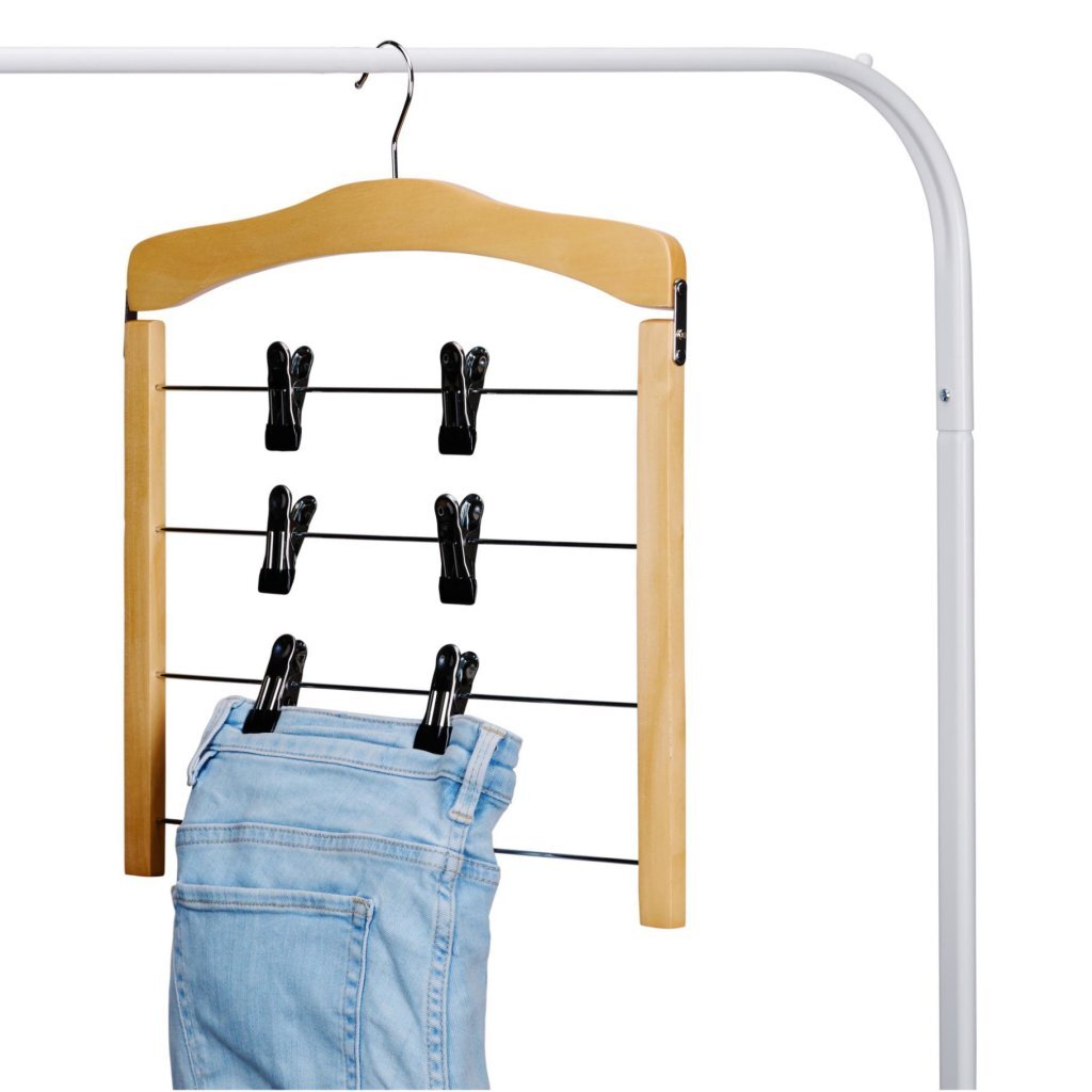 Deze ruimtebesparende Alpina broekhanger met knijpers is een handige hanger om kledingstukken zoals broeken en rokken aan te hangen. Hij beschikt over 4 lagen en 8 wasknijpers. Met een 360° flexibele ophanghaak zodat de hanger makkelijk in je kast past.