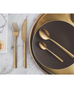 Je kan met Amefa vintagegouden bestek mooie combinaties maken en een eigen sfeer creëren. Koper is één van de trendkleuren van dit moment. De kleur is goed te combineren met ijsblauw, oudroze, wit, zwart,koper en zilver en hout, ook in je tafelsetting. De 16-delige set bestaat uit: 4 tafelmessen, 4 tafelvorken, 4 tafellepels en 4 koffielepels.
