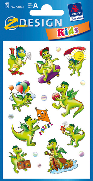 Kleurrijke papieren stickers, deels met glitters of reliëf. Formaat vel 76x120mm. Aantal vel 3. Motief draken.