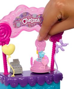 De toonbank van de snoepwinkel heeft een kassa en een draaiende display met lolly’s. Accessoires te koop bij het lolly- en snoepstalletje inclusief een schattige teddybeer, 5 lollytraktaties en 2 leuke ballonnen die echt passen in de poppenhandjes. Deze Chelsea pop is klaar om het snoepstalletje te beheren in haar roze zonneklep en schortje. Kinderen kunnen dit favoriete moment uit de animatiefilm Barbie and Stacie to the Rescue naspelen! Pop kan niet los staan. Afwijkende kleuren en versieringen mogelijk. Geschikt voor kinderen vanaf 3 jaar.