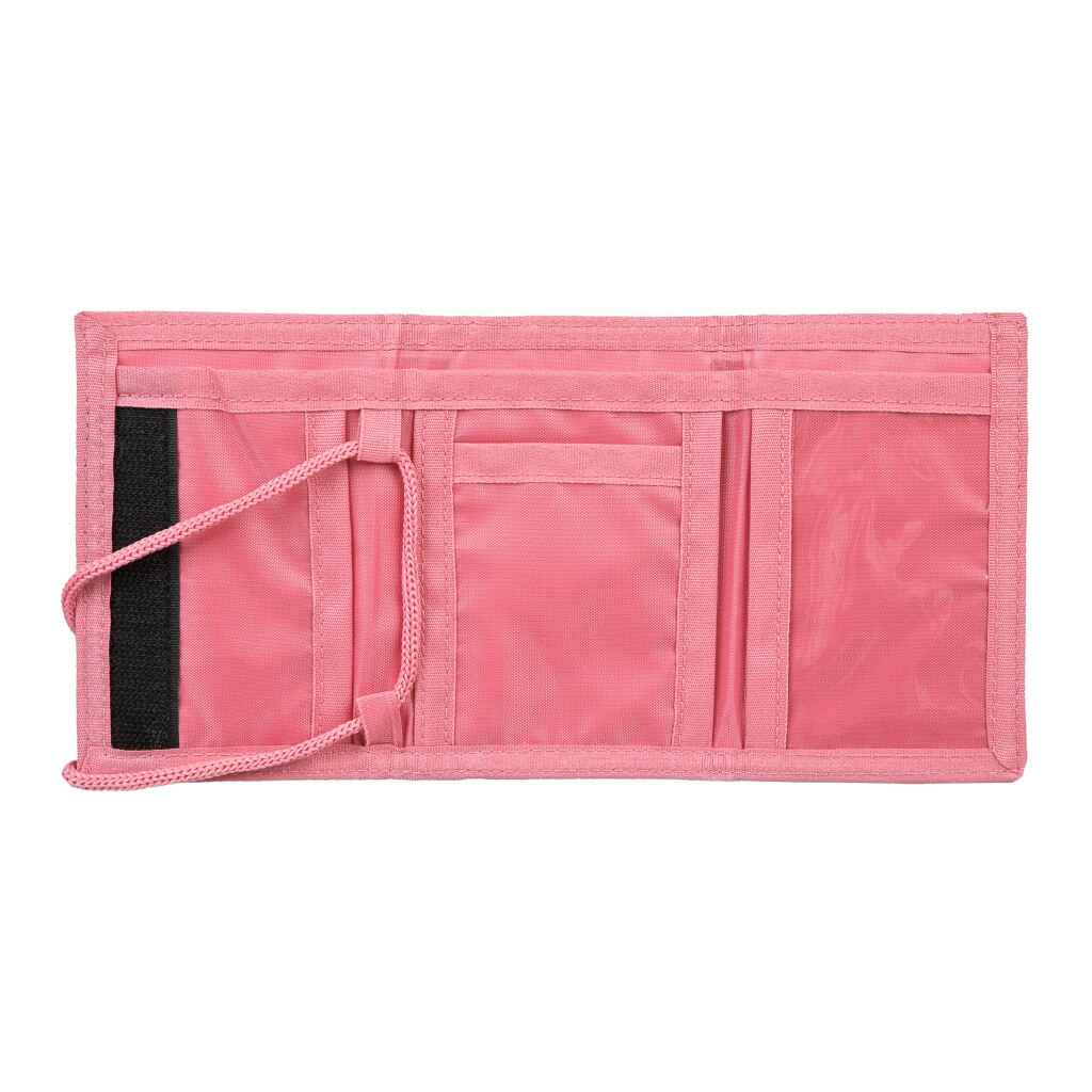 Barbie roze-zwarte portemonnee, borstzak formaat, van polyester met klittenband- en veiligheidssluiting, vakje voor de bankbiljetten, vak met rits voor kleingeld aan de achterkant, 2 extra steekvakken en nog een steekvak met kijkvenster aan de binnenkant.