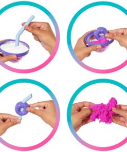Draai het deksel in de vorm van een slagroomtoefje los om kneedbaar zand te ontdekken. Prik met het rietje door het folielaagje voor een dolle sponsachtige sensatieen een leuke accessoire voor het rietje! Open de verpakking door het laagje van de beker af te pellen en je ontdekt een Donut Dromen Barbie modepop met een heerlijk zoete geur, beweegbare gewrichten en lang paars haar!