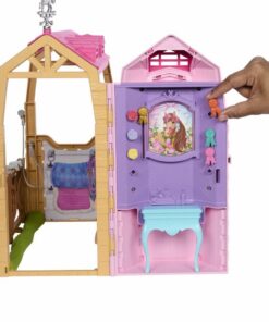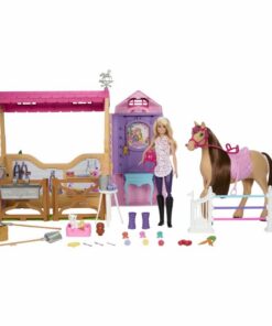 The Great Horse Chase, en bevat meer dan 25 onderdelen voor urenlang speelplezier! Met 6 speelplekken kunnen kinderen Barbie helpen en haar paard trakteren op lekkere hapjes bij het voederstation, staart en manen schoonmaken en borstelen in het verzorgingsgedeelte, het paard trainen om over een hindernis te springen, rozetten ophangen of foto’s verwisselen aan de trofeewand, en tuinieren met insteekroosjes. De stal kan ook worden ingeklapt, zodat je de set gemakkelijk kan opbergen en meenemen. Pop kan niet los staan. Afwijkende kleuren en versieringen mogelijk. Geschikt voor kinderen vanaf 3 jaar.