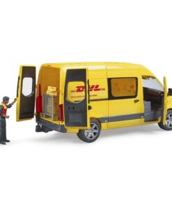 Deze Mercedes Benz Sprinter is erg gedetailleerd uitgevoerd en heeft achterdeuren en een zijdeur die open kunnen. De gele bus heeft de bekende DHL bestickering en een pakketbezorger als bestuurder. Achterin de wagen liggen pakketten. Geschikt voor kinderen vanaf 4 jaar.