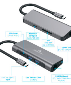 - Aansluiting: USB-C (M) – 2x USB-A (F) + HDMI (F) + USB-C (F) + RJ45 + Micro-SD + SD