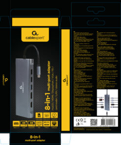 - USB Type-C 8-in-1 multi-poort adapter (Hub3.0 + HDMI + DisplayPort + VGA + PD + kaartlezer + LAN + stereo audio)