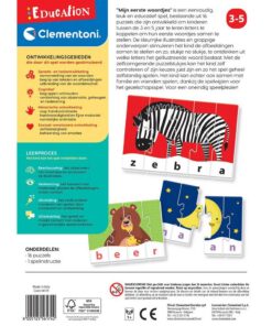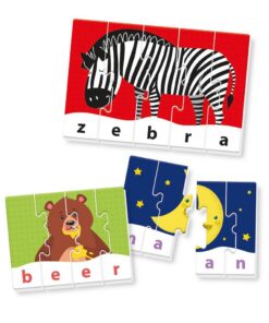 Een eenvoudig, leuk en educatief spel, bestaande uit 16 puzzels die zijn ontwikkeld om kinderen tussen de 3 en 5 jaar te leren letters te koppelen om hun eerste woordjes samen te stellen.De kleurrijke illustraties en grappige onderwerpen stimuleren het kind de afbeeldingen samen te stellen en zo, stukje na stukje, te ontdekken uit welke letters het geïllustreerde woord bestaat. Met de zelf corrigerende puzzelstukjes kan het kind zelf controleren of zijn keuzes juist zijn en zo het spel geheel zelfstandig spelen. Het kind kan echter ook samen met familie en vrienden spelen, dankzij de spelwijzen voor het gezellschapsspel. Voor een oneindig speelplezier.