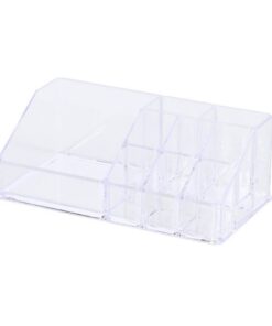 Een transparant cosmetica opbergbakje met diverse vakken voor het opbergen van diverse make-up producten. Afmetingen: 17,5 x 9,5 x 6,5 cm.