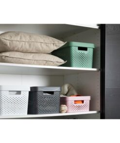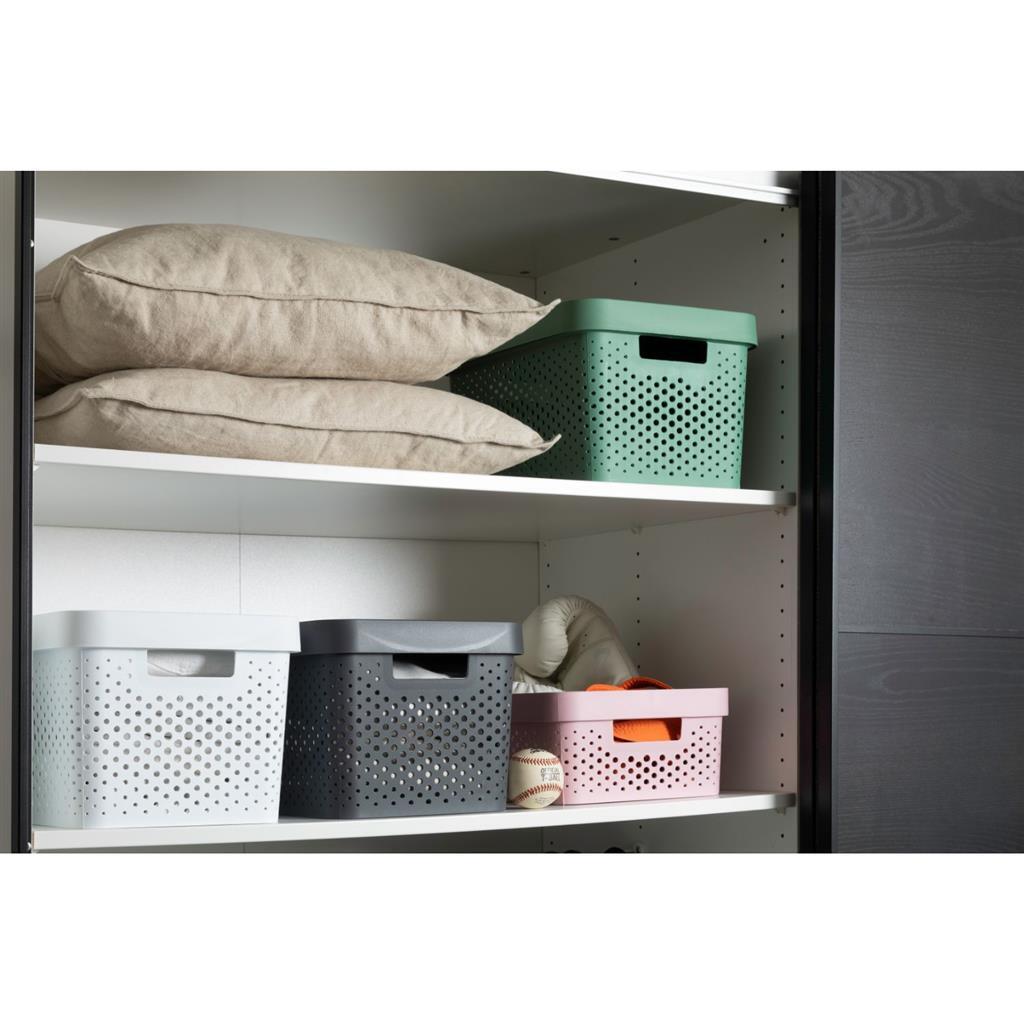 In dezeantracieteInfinity Dots box past een inhoud van 11 liter.De Curver InfinityDots lijn is verkrijgbaar in verschillende kleuren en structuren, geïnspireerd op Scandinavisch design De boxen hebben comfortabele handgrepen, zijn eenvoudig schoon te maken en zijn makkelijk stapelbaar met deksel (apart verkrijgbaar). Met kleuren die passen bij elke smaak, van een klassiek wit tot donkergrijs, laten de producten zich perfect met elkaar combineren in een oneindig aantal mogelijkheden! Een ware toevoeging aan iedere huiskamer, slaapkamer, speelkamer etc.