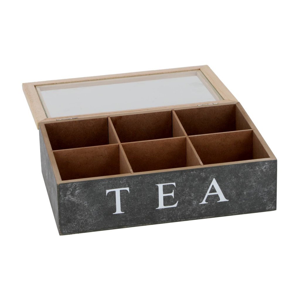 Theedoos van Daily Home met 6 vakken. Gemaakt van MDF met glazen deksel. Zwart design met houten rand en “TEA”-opdruk. Ideaal voor het overzichtelijk opbergen van theezakjes.