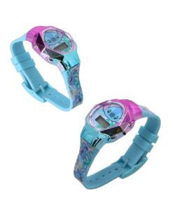 Knipperende LCD kinderklok in Stitch design – De stijlvolle digitale klok met mooie accessoires in een mooie cadeauverpakking! De kleurrijke kinderhorloges zijn de perfecte gadget voor thuis of op het schoolplein. Vooral met de mooie accessoires die bij de horlogeset zijn inbegrepen: Naast het knipperende LCD-horloge is er nog een pailletten- en glitterarmband en een mooie kleurrijke haarband met scrunchie! Het polsbandje van het LCD horloge meet ongeveer 22 x 2 cm en is in lengte verstelbaar. De gebruikte materialen zijn licht van gewicht en verspreiden geen kunstmatige geuren. De klok knippert met één druk op de knop en stopt na een paar seconden weer, zodat de batterij lang meegaat. De klok is zeer eenvoudig te bedienen en geeft informatie over de tijd (uren, minuten), seconden, maand en dag. Alle instellingen kunnen snel en eenvoudig worden ingesteld met de knoppen aan de rechterkant van de behuizing. Er wordt een meertalige handleiding meegeleverd. Verpakking bevat: Knipperend LCD kinderhorloge, pailletten polsbandje, glittersteek design polsbandje, scrunchie haarbandje en meertalige instructies. Batterijen voor de LCD klok met digitaal display: 2x LR41. Afmetingen LCD klok 22 x 2 cm; Afmetingen etui: 3,9 x 4 x 0,9 cm; De LCD cadeausets zijn ook verkrijgbaar met andere karakters uit trendy licenties.