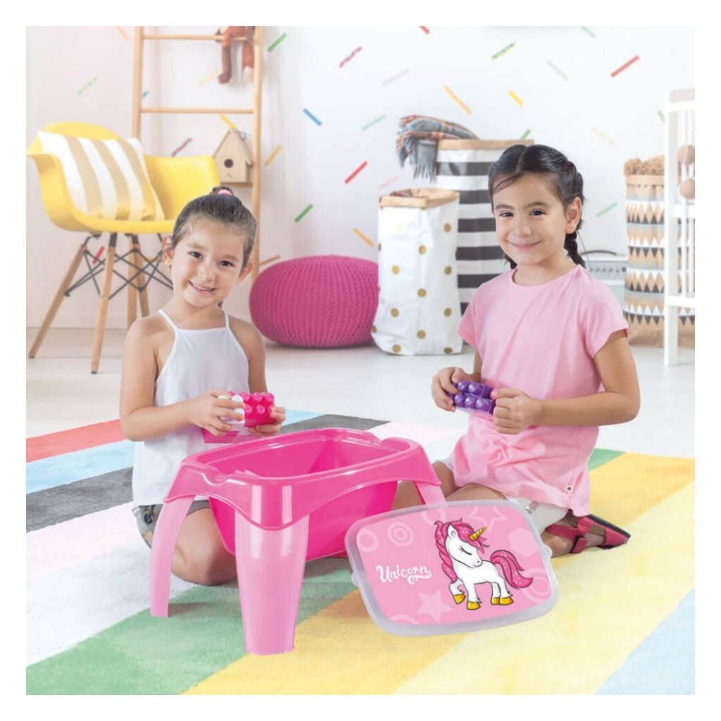 Dolu roze eenhoorn activiteitentafel met 30 blokken. Geschikt voor kinderen vanaf 1 jaar.