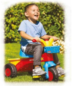 Om je kindje een beetje op weg te helpen, heeft hij een handige duwstang achterop het fietsje zitten. Wil je kindje spulletjes meenemen? In de mandjes achterop en voorop de driewieler is er ruimte om spullen op te bergen en ze zo mee te nemen. Daarnaast heeft de drieweler een toeter die geluid maakt als je kindje daarop drukt, hoe leuk is dat? Kleur: blauw/rood/geel. Geschikt voor kinderen vanaf 2 jaar.