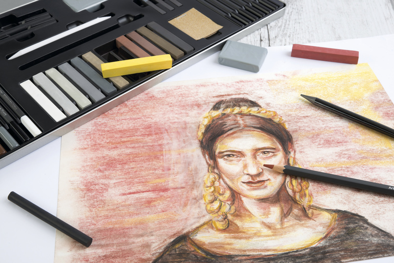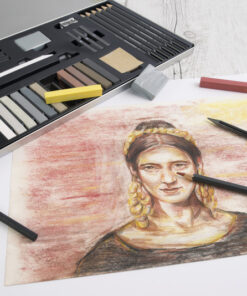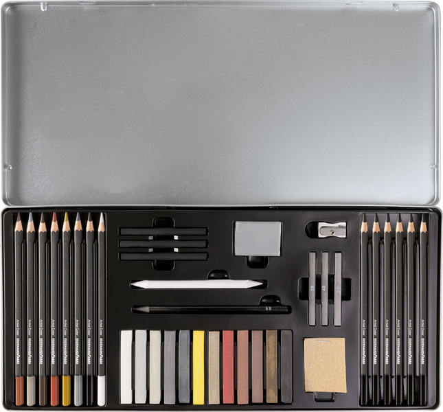 Inhoud: 6 tekenpotloden(HB, B, 2B, 4B, 6B, 8B), 3 x geperst houtskool ( soft, medium en hard), 1 kneedgum, 1 doezelaar, 1 metalen puntenslijper, 12 x pastelkrijt (kleur :wit, cadmiumgeel, gebrande sienna, koudgrijs V, koudgrijs IV, warmgrijs IV, warmgrijs I, nougat, Venetiaans rood, caput mortuum, gebrande amber, donker sepia), 3 grafietpotloden (2B,4B en 6B), 2 x schuurpapier, 1 grafietpotlood pure en 8 kleurpotloden (kleuren: wit, gebrande sienna, sanguine, Napels geel, van Dyck bruin, koudgrijs, warmgrijs en zwart). De potloden hebben een kerndiameter van 3,8mm.