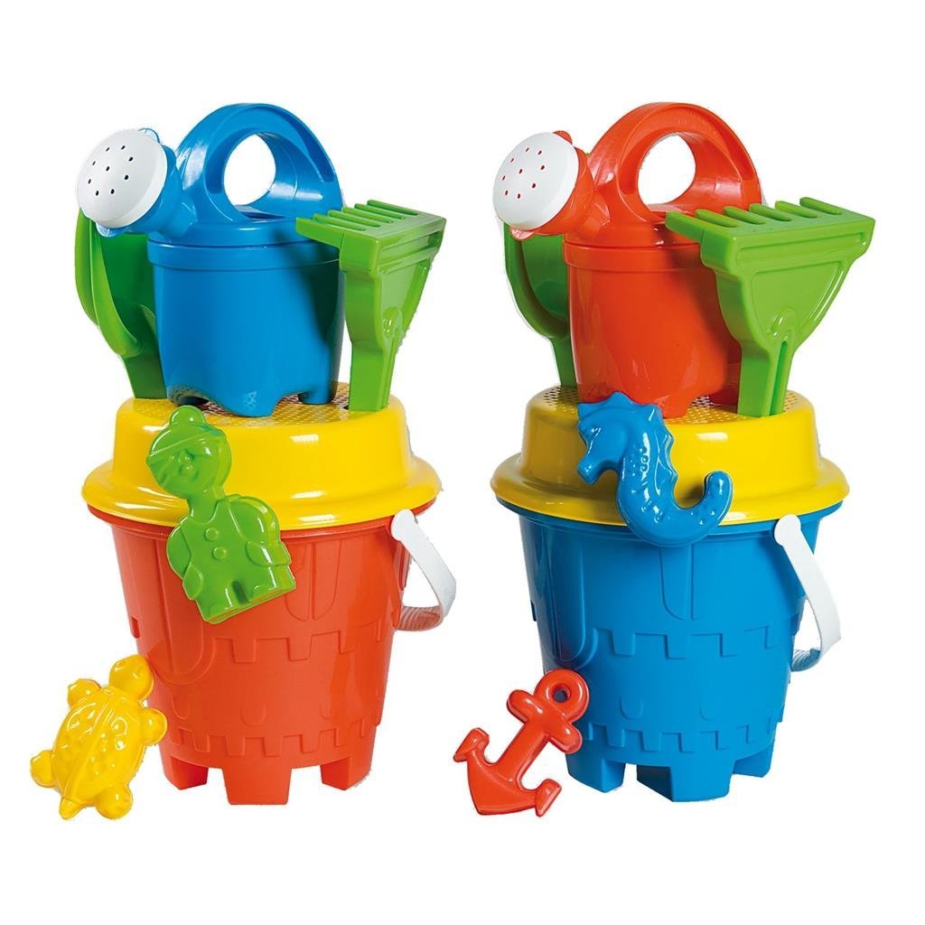- Met gieter, harkje, schepje, zandvormpje, vergiet en emmertje met diameter van 15 cm