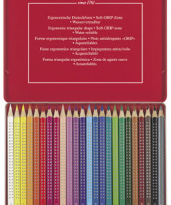 Kleurpotlood in ergonomische driehoekige vorm met gepatenteerde Soft-Grip-zone. Stift bevat zeer lichte pigmenten en is wateroplosbaar. Driehoekige vorm bevordert de drie punt grip. Geschikt voor rechts- of linkshandige kinderen. Breukvast vanwege speciale belijming. Met ruimte voor uw naam. Kan uit de meeste stoffen worden gewassen. Eenvoudig te slijpen met een kwaliteit slijper.. Metalen etui à 24 stuks.