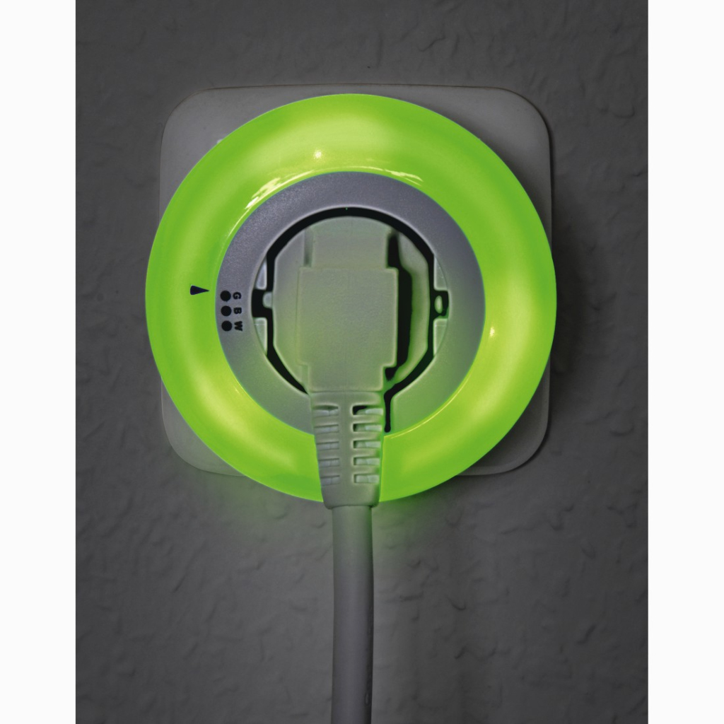 - Energiebesparende led-nacht- en oriëntatieverlichting (wit, groen, blauw) met schemersensor en geïntegreerd stopcontact met extra aanraakbeveiliging voor gebruik in kinderkamers, gangen, kelders, etc