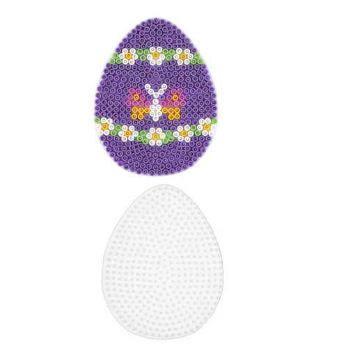 Strijkkralen kun je in bijna elk gewenst patroon leggen en dan door middel van strijkpapier en een strijkijzer samensmelten. Maar daarvoor heb je natuurlijk wel een grondplaat nodig. Eivormige grondplaat.