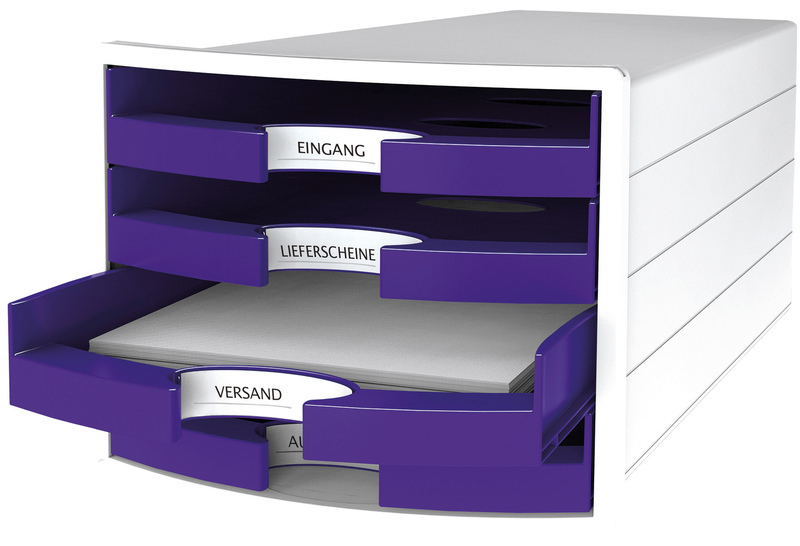Ladenkastje van antistatisch polystyrol. Witte ombouw met 4 open laden. Voor het bewaren, verzamelen of sorteren van al uw bescheiden die u op uw werkplek onder handbereik wilt hebben. Laden voorzien van uittrekblokkering, met elegant geïntegreerde labelhouders. Beschrijfbare labels worden meegeleverd. Het zeer stabiele ladenkastje staat op 4 rubberen voetjes en is tevens geschikt om er een beeldscherm op te plaatsen. Afmetingen ladenkastje: 280x367x235mm (bxdxh), binnenmaat lade: 240x325x37mm (bxdxh). Verpakt per stuk in een doos. Kleur paars.