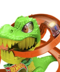 inderen lanceren het meegeleverde 1:64 schaal gegoten speelgoedvoertuig en het zoeft rond de dino met drie mogelijke uitkomsten: opgegeten worden en uitgepoept, een omweg nemen om te tanken, of het beest overwinnen en vrienden redden. Elke keer dat auto’s voorbij zoeven, draaien de ogen van de T-Rex en schudden zijn armen totdat hij eindelijk instort! Er is opbergruimte voor extra auto´s en details om rond te duwen voor open storytelling. Kleuren en decoraties kunnen variëren. Geschikt voor kinderen vanaf 4 jaar.