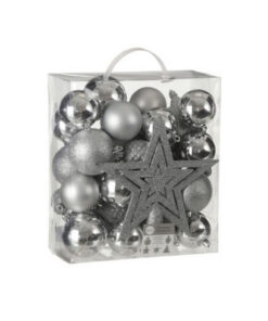 Versier de kerstboom met deze zilverkleurige decoratieset van House of Seasons en je hebt er gegarandeerd plezier van. De set bestaat uit 40 verschillende kerstboom ornamenten in de vorm van kerstballen, sterren en dennenappels. De diameter is ongeveer 8 cm. Ook zit er een stervormige piek bij die feestelijk is versierd met glitters. De items laten jouw kerstboom stralen en zijn ook nog eens onbreekbaar. Ze zijn namelijk gemaakt van kunststof, ook al zie je dat er niet aan af. De kunststof kerstballen hebben een zilveren kleur, uitgevoerd in verschillende tinten en met meerdere afwerkingen. Kortom, een gezellige en feestelijke kerstsfeer met een chique touch!