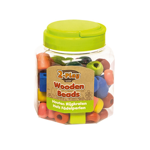 Pot met 72 gekleurde houten kralen in verschillende vormen