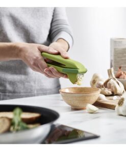 Wanneer je de knoflook door het messenblad drukt zorgt de geïntegreerde schaaf ervoor dat de overtollige knoflook automatisch van het blad geschraapt wordt. Ideaal om zo min mogelijk knoflook verloren te laten gaan. Daarnaast vind je in de handgreep een handige reinigingstool om je te helpen om de overgebleven schil uit de pers te halen en de gaatjes in het blad te legen. Kleur: groen.