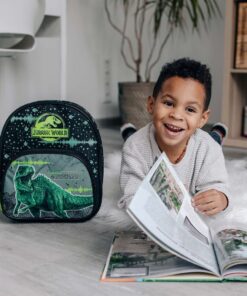 Deze Jurassic World rugzak is perfect voor mee naar de opvang, naar de kleuterschool of mee op uitstapjes. Deze duurzame rugzak heeft een voorvak met ritssluiting en een groot hoofdvak om je spullen veilig in op te bergen. De schouderbandjes zijn verstelbaar en kunnen zo aangepast worden dat de rugzak altijd comfortabel draagt. Met een draaglus aan de bovenkant is de tas ook makkelijk in de hand te dragen en op te hangen op school. In zwart groene uitvoering. Afmetingen: 30,5 x 25,5 x 10 cm. Geschikt voor kinderen vanaf 3 jaar.