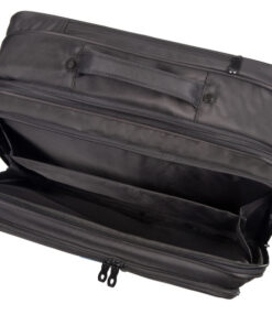Zwarte laptoptrolley van gerecycles PET. Met volledig inschuifbaar trolleysysteem, trolleyband, handvat, 2 kwaliteitswielen, haken voor schouderriem, flessenhouder. Binnenkant: gewatteerd hoofdvak voor laptop tot 17″ of tablet, ruimte voor ordner of documenten, vak met rits en 2 A4 binnenvakken, vak met rits voor 3 pennen/stiften, 2 inschuifvakken. Voorvak met rits.