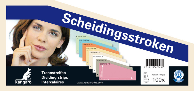 Scheidingsstrook, trapeziumvormig vervaardigd uit 180 grs zuurvrij recycled karton, onbedrukt, 2-gaats ponsing h.o.h. 8 cm aan 1 korte zijde. Kleur beige. Pak a 100 stuks.