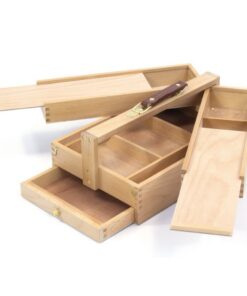 Voorzien van leren handvat en 3 lagen met opbergmogelijkheden. Bovenzijde lades met schuifdeksel zijn draaibaar naar buiten, waarvan een voorzien van 3 vakken en andere met grote vak zonder verdeling. Vast te zetten met draaihaken. Daaronder een compartiment met vaste vakindeling. Aan de onderzijde zit een uitschuifbare lade die voorzien is van knopgreep.