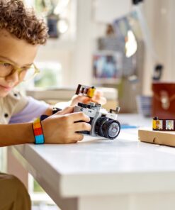 Deze klassieke speelgoed camera heeft een beweegbare lens, knoppen aan de bovenkant, een achterkant die open kan om een stuk film te plaatsen en een kleurrijke draagriem van textiel. Er zijn ook 6 stickers die kinderen aan de film kunnen toevoegen als ‘foto’s’. Met deze Creator 3in1 retro speelgoed set krijgen kinderen 3 verschillende bouw- en speelervaringen met dezelfde stenen. Ze kunnen een fotocamera bouwen en deze vervolgens ombouwen tot een retro videocamera of een klassieke speelgoed televisie met antenne. Alle 3 de modellen zien er prachtig uit op een plank in de kinderkamer als decoratie. Creator 3in1 speelgoed is een geweldig cadeau met 3 mogelijkheden in elke doos. Kinderen zullen de modellen graag bouwen, herbouwen en opnieuw bouwen. De 3in1 sets sluiten aan op hun interesses, waaronder supersnelle voertuigen, geweldige dieren en gedetailleerde stadstaferelen. Bevat 261 onderdelen. Geschikt voor kinderen vanaf 8 jaar.
