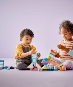 3, 2, 1… Lanceer speelmomenten boordevol activiteiten met deLego Duplo 10422 3in1 Ruimteavontuur set om te bouwen en herbouwen. De fantasie neemt een vlucht als peuters astronauten spelen die het heelal verkennen in een ruimteschip, buitenaardse wezens ontmoeten en meer te weten komen over het zonnestelsel. Dit ruimtespeelgoed zit boordevol leuke accessoires die creatief spel stimuleren. Peuters verbreden hun horizon terwijl ze avonturen in de ruimte bedenken voor de 2 astronautenfiguren, zoals vrienden worden met een buitenaards wezen of een ruimtewandeling maken om de raket te repareren met hun speelgoedmoersleutel. Deze veelzijdige 3in1 bouwset wordt geleverd met veel interessante stenen en elementen die kunnen worden omgebouwd tot nog 2 ruimtevoertuigen, een basis op een planeet of iets heel anders! Met tandwielen, een draaiende propeller, een opwindbare lier, scharnierende deuren en een verlichtingssteen stimuleert dit peuterspeelgoed ook de fijne motoriek. 58-delig. Geschikt voor kinderen vanaf 3 jaar.
