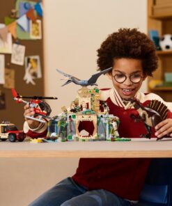 Dit op de film geïnspireerde cadeau bevat 2 voorgevormde Jurassic World Rebirth dinosaurussen en 4 filmpersonages: Martin Krebs, Zora Bennett, Duncan Kincaid en dr. Henry Loomis. De Spinosaurus heeft beweegbare poten, staart, kop en kaak. De Quetzalcoatlus heeft beweegbare vleugels en een openende kaak. Bovendien is er een oude tempel met een waterval, een valstrik met vallende bijlen, instortende zuilen, een nest en eieren. De set bevat ook een helikopter, een truck, een etui, 3 injectiespuiten en meer. Deze bouwset kan worden gecombineerd met andere sets uit de Jurassic World reeks (apart verkrijgbaar). De Builder app begeleidt kinderen op een intuïtief bouwavontuur, waarbij ze kunnen inzoomen en modellen in 3D kunnen draaien, sets kunnen opslaan en hun voortgang kunnen bijhouden. De set bevat 984 onderdelen.