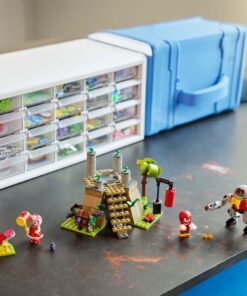 Het Lego Sonic the Hedgehog verzamelspeelgoed bestaat uit een tempel met 4 Chaos Emeralds, een verblijf voor Knuckles met trainingsruimte onder het heiligdom, een draaiende vloer en een wijnrank, Amy’s hamer en een katapult om druiven richting de Eggrobo te schieten. Het bevat 4 personages: minifiguren van Knuckles en Amy, een verstelbare Eggrobo Badnik met een jetpack en noppenschieter en een Picky. Deze Sonic speelset is speelgoed waarmee fans samen met Knuckles en Amy verhalen kunnen bedenken: van sporten en druiven oogsten tot het verdedigen van het heiligdom en de Chaos Emeralds. Kinderen kunnen de Eggrobo verslaan, de Picky redden en zich daarna ontspannen met een lekkere snack. Kinderen kunnen ook genieten van een intuïtief bouwavontuur met de Builder app. Hiermee kunnen ze inzoomen en hun modellen draaien, sets opslaan en hun voortgang bijhouden. 325-delig. Geschikt voor kinderen vanaf 8 jaar.
