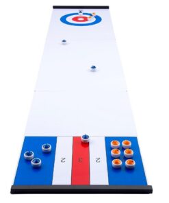 Dit board biedt 2 spellen in één en is perfect om op de keukentafel te spelen! Het bord is 39 cm breed en 180 cm lang en past daardoor ideaal op een eettafel. Met de bijbehorende stenen kunnen de spellen curling en sjoelen gespeeld worden. De drie losse borden worden eenvoudig één speelveld door ze met elkaar te verbinden met de magneetstrips. Inhoud: speelveld, bestaande uit 3 delen, pucks, wissertje, 2 opbergzakjes en spelregels. Wordt in full-colour doos geleverd. Geschikt voor kinderen vanaf 6 jaar.