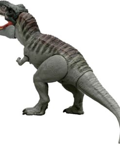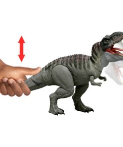 Deze Grote Verslinder Tyrannosaurus Rex, geïnspireerd op Jurassic World Rebirth, blijft woest om zich heen happen! Wanneer je de tong omlaag duwt, hoor je eerste een overwinningsbrul. Wanneer je de tong langer omlaag houdt, activeer je constante, razende bijtbewegingen met licht en geluid! Met deze functie kun je een woeste strijd aangaan met andere dinosaurusfiguren, want de T-Rex blijft happen! Met de staart laat je de kop van de dino op en neer of heen en weer gaan, met wijd geopende kaken! Scan de traceercode op de voet van de dinosaurus in de gratis Jurassic World Play app met een geschikt smart apparaat (Android of iOS, niet inbegrepen) om een digitale versie van de dinosaurus te ontgrendelen en een leuke woeste game te spelen waarin je met diverse voertuigen over land, in de lucht of over de zee gaat racen. Een geweldig cadeau voor dinofans vanaf 4 jaar. Kleuren en versieringen kunnen variëren.