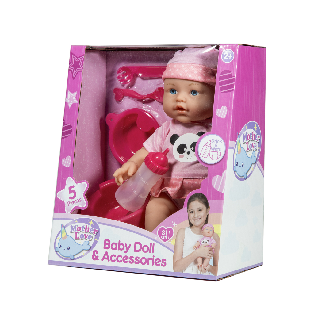 Mother Love babypop met hard lijfje, met drink en plas functie. Er worden 5 accessoires meegeleverd: lepel, vork, bordje, melkfles en plaspotje. Lengte van de pop: 31 cm. Geschikt voor kinderen vanaf 2 jaar. Verkrijgbaar in verschillende uitvoeringen. U kunt niet kiezen, maar ontvangt een willekeurige uitvoering.