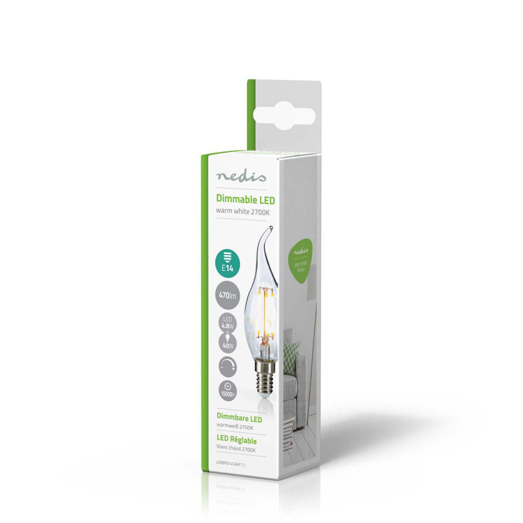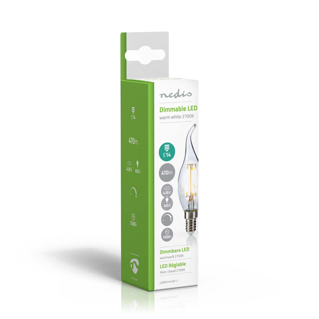 Retro Vlamvormige filament LED-lamp en E14-fitting, 470 lumen en een zeer laag energieverbruik van 4.8 watt, ter vervanging van de traditionele 40-watt gloeilampen en voor directe energiebesparing. Deze lamp bespaart zelfs meer energie dan traditionele LED-lampen. De lamp verspreidt een warm wit licht met een kleurtemperatuur van 2700 kelvin.