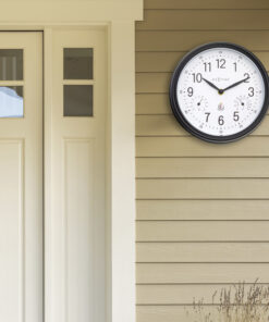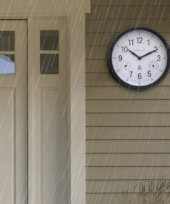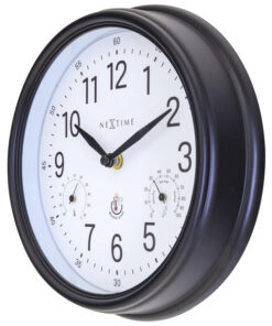 DeNeXtime NE-4318WI buitenklok Jasmine verteld meer dan alleen de tijd. Deze wandklok heeft namelijk ook een thermometer op de index welke de temperatuur in Celsius weergeeft en geeft de luchtvochtigheid aan. Deze klok heeft subtiele zwarte rand met een witte wijzerplaat met een duidelijke cijfer en streep index. Het gebruik van extra rubberen ringen om te voorkomen dat het water de kwetsbare delen van de klok bereikt, maakt deze klok bijzonder en weerbestendig. De klok is geschikt voor zowel binnen als buiten en werkt op 1x AA-batterij (niet inbegrepen). Diameter: 23,5 cm.