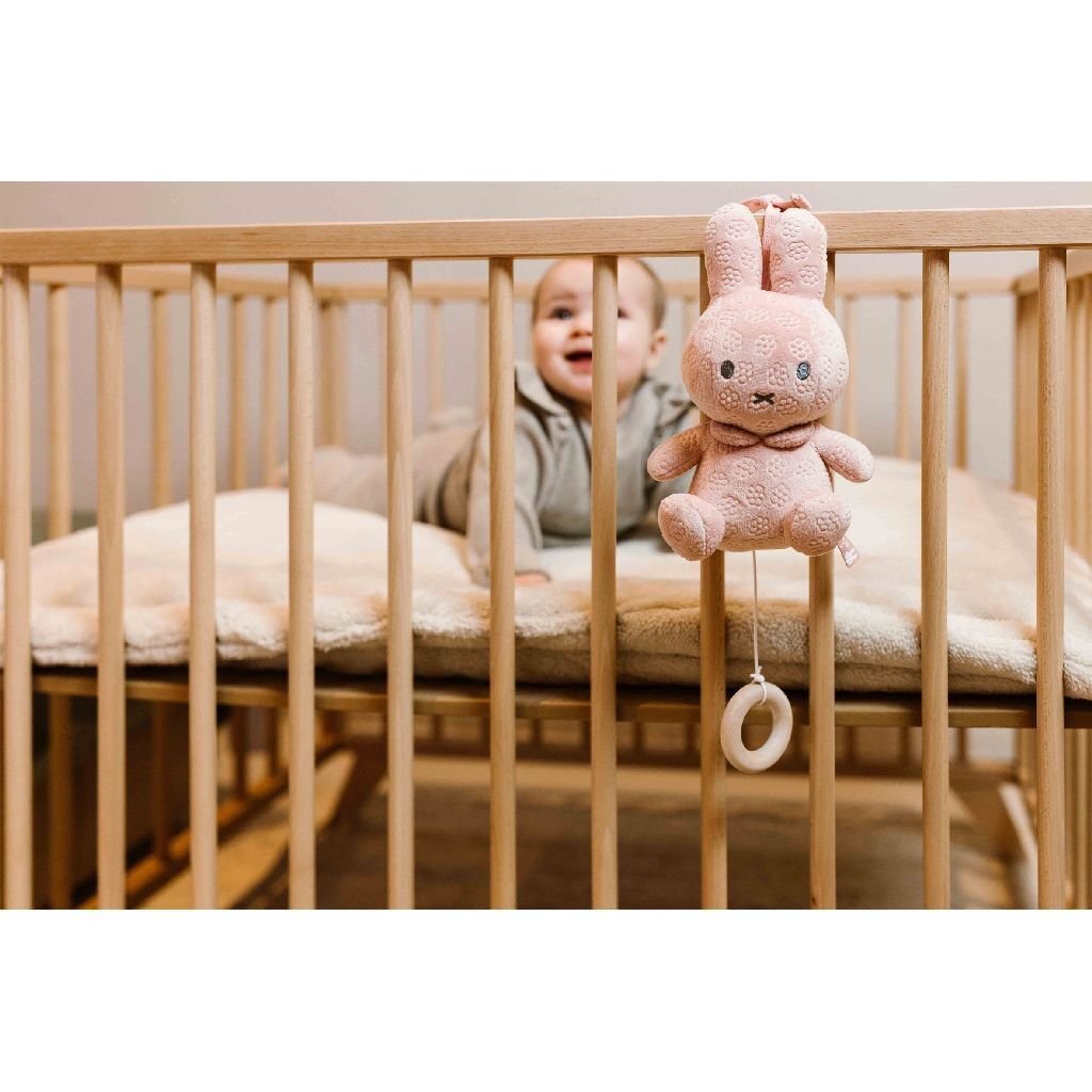 Nijntje, lief klein konijntje. Speel de melodie van het bekende Nijntje deuntje af door aan het touwtje te trekken. Door de zachte stof, met gestanste bloemetjes, is dit muziekdoosje een echte aanwinst voor in de wieg of aan de box. Het muziekdoosje is eenvoudig te bevestigen door middel van het lusje. Leeftijd: vanaf de geboorte. Kleur: roze.