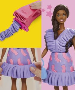 Maak superschattige stijlen met de set Fashionista-franjes! Het is eenvoudig en leuk om Play-Doh-Barbiepopkleding te maken met deze knutselset. Zet de pop gewoon op de standaard, gebruik het Play-Doh-patroonvel en de uitsteekvormpjes om Barbie-jurkjes te snijden en kleed haar aan op alle denkbare, creatieve manieren. Geef haar 2 verschillende Play-Doh-kapsels met de haarvormpjes voor kort of lang haar of kinderen kunnen hun eigen stijlen creëren met de hand. Voeg Barbiepop-accessoires zoals een tasje en schoenen toe om haar look compleet te maken. Laat je fantasie de vrije loop met de 2 potjes Play-Doh-boetseerklei om nog meer details toe te voegen. Geef een fantastisch modieus cadeau aan kinderen die houden van Barbie-speelsets en Play-Doh-speelgoed! Geschikt voor kinderen vanaf 5 jaar.