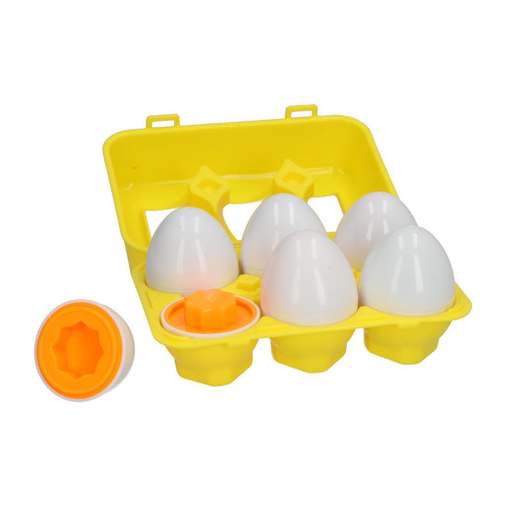 Dit is een vormenstoof in de vorm van een eierdoos. De 6 eieren hebben vanbinnen verschillende kleuren en vormen. Geschikt voor kinderen vanaf 15 maanden.