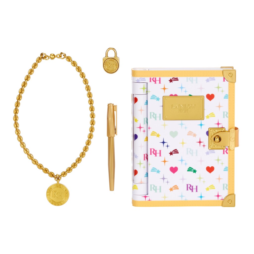 Laat je inspireren door het activiteitenboekje, net als de leerlingen van Rainbow High, en sla al je geheimen op in dit prachtige, meerkleurige geheime dagboek. Bewaar je geheimen en diepste gedachten veilig via het slotje dat je alleen kunt openen met de hanger. Plaats de ketting op het Rainbow High-vergrendelplaatje om het slot te openen. Er wordt zelfs een Rainbow High-lied afgespeeld zodra je het dagboek opent! Het slot heeft een dubbelfunctie en kan ook een sieraad voor jou zijn. Dit dagboek bevat een activiteitenboekje en bijpassende gouden pen, perfect voor schetsen, foto’s, mode-ontwerpen, activiteiten en meer. Je kunt de pen van je activiteitenboekje en nog meer in jouw dagboek opslaan. Het geheime dagboek van Rainbow High bevat een activiteitenboekje, dagboek, hanger, slotje en pen. Geschikt voor kinderen vanaf 6 jaar.