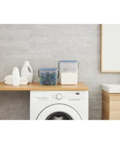 Handige bewaarbox voor waspoeder, gemaakt van doorzichtig kunststof, met een goedslutiend deksel en een hengsel voor het oppakken. De box heeft een inhoud van 4,5 liter, en is 21 x 20 x 18 cm groot. Kleur: horizon blauw/transparant.