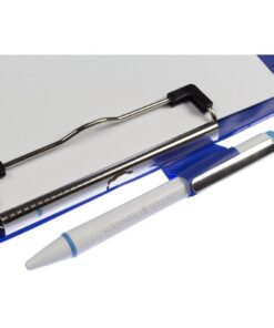 - Dit is een vouw-klembord en heeft een stevige polyvinylchloride beklede plaat (3 mm karton) met een platte heavy duty clip en penlus