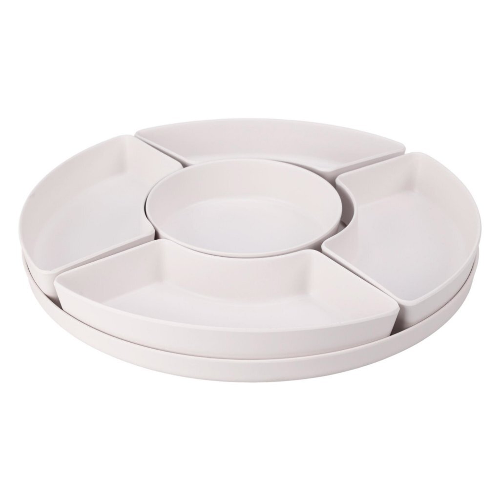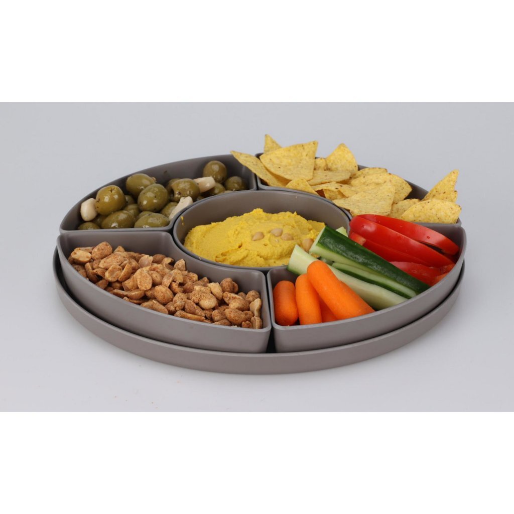 Een serveerbord met 4 uitneembare schaaltjes voor bijvoorbeeld groenten, chips, kaas, etc. Met uitneembaar schaaltje voor dip. Verkrijgbaar in verschillende kleuren. U kunt niet kiezen, maar ontvangt een willekeurige kleur.