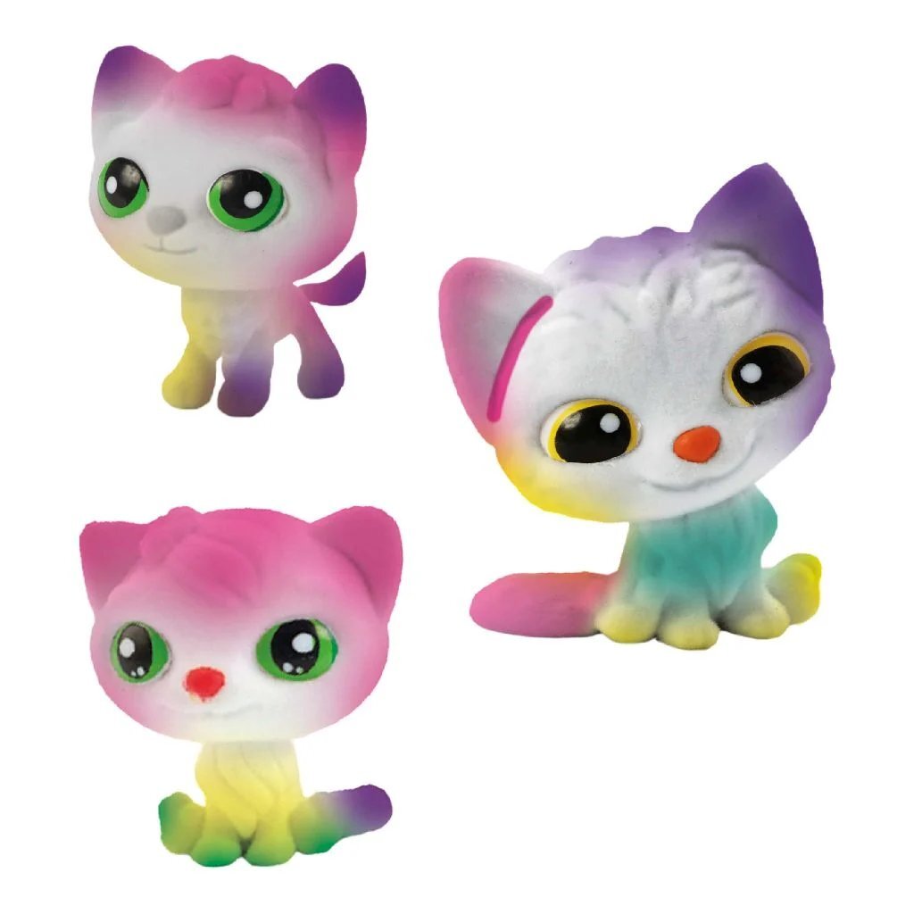 Drie verrassingen wachten om gevonden te worden. Vind de katjes, met hun zachte witte vachtjes. Met de vier gekleurde blaas airbrush pennen geef je iedere kitten vrolijke kleuren, stippen en strepen. Klaar? Was ze onder de kraan schoon en ze zijn klaar voor een nieuwe creatie!